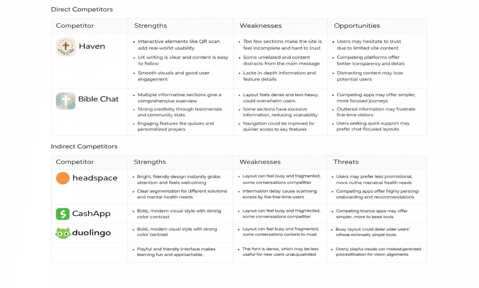 During competitor analysis we found only two direct competitors with landing pages, so we explored well designed indirect examples to set a stronger quality benchmark