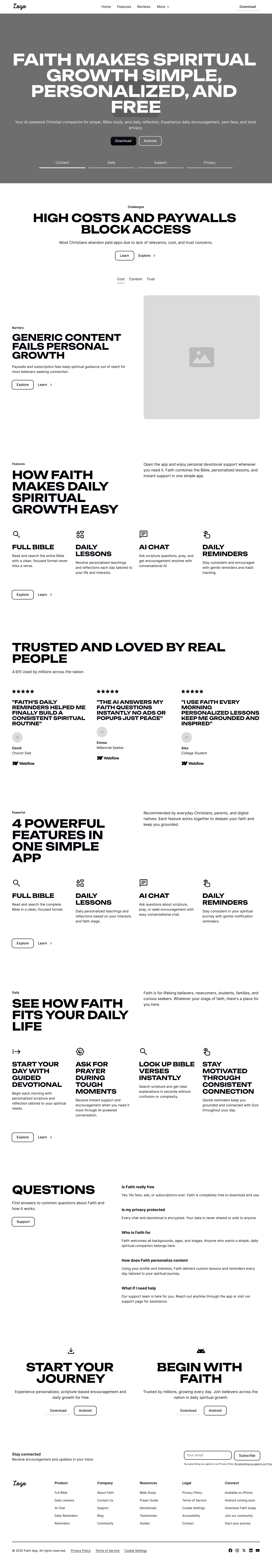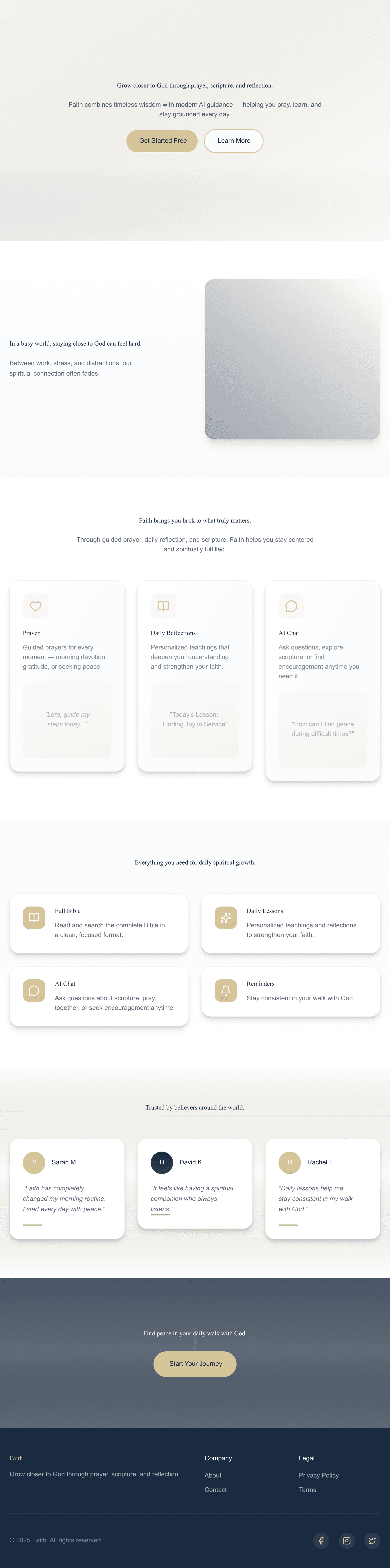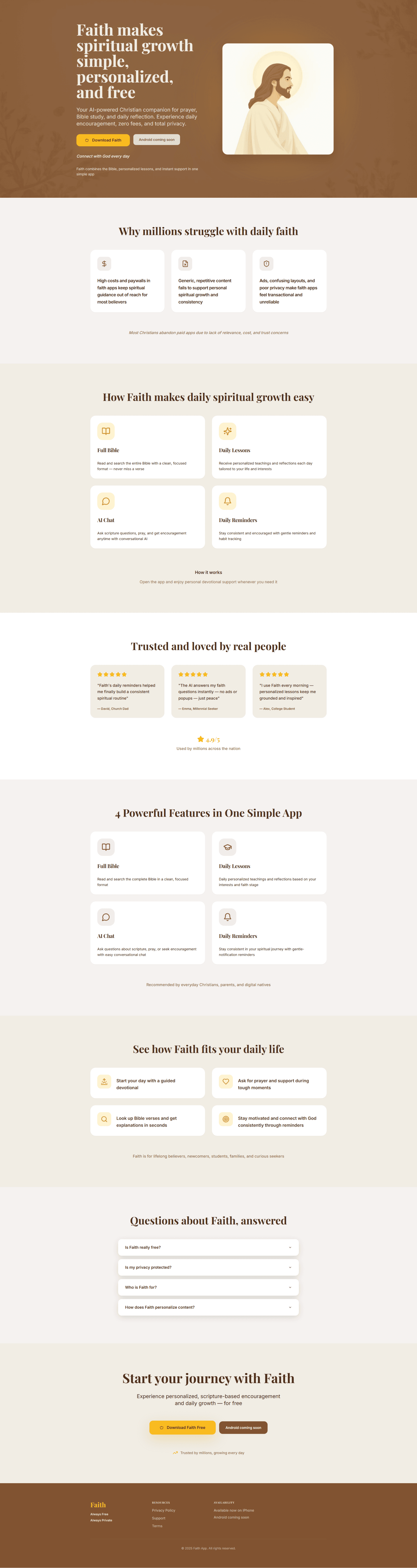 We designed a landing page for a daily companion app for growing closer to Jesus with lessons, scripture, AI chat, and gentle reminders